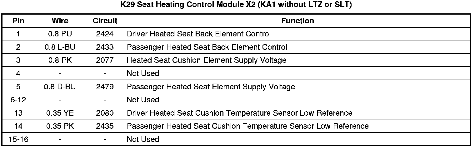 K29 Seat Heating Control Module X2 (KA1 without LTZ or SLT)