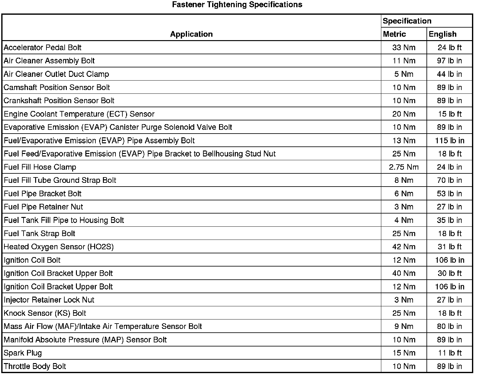 Fastener Tightening Specifications