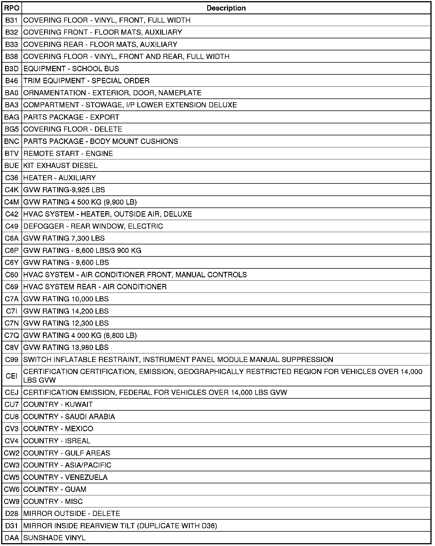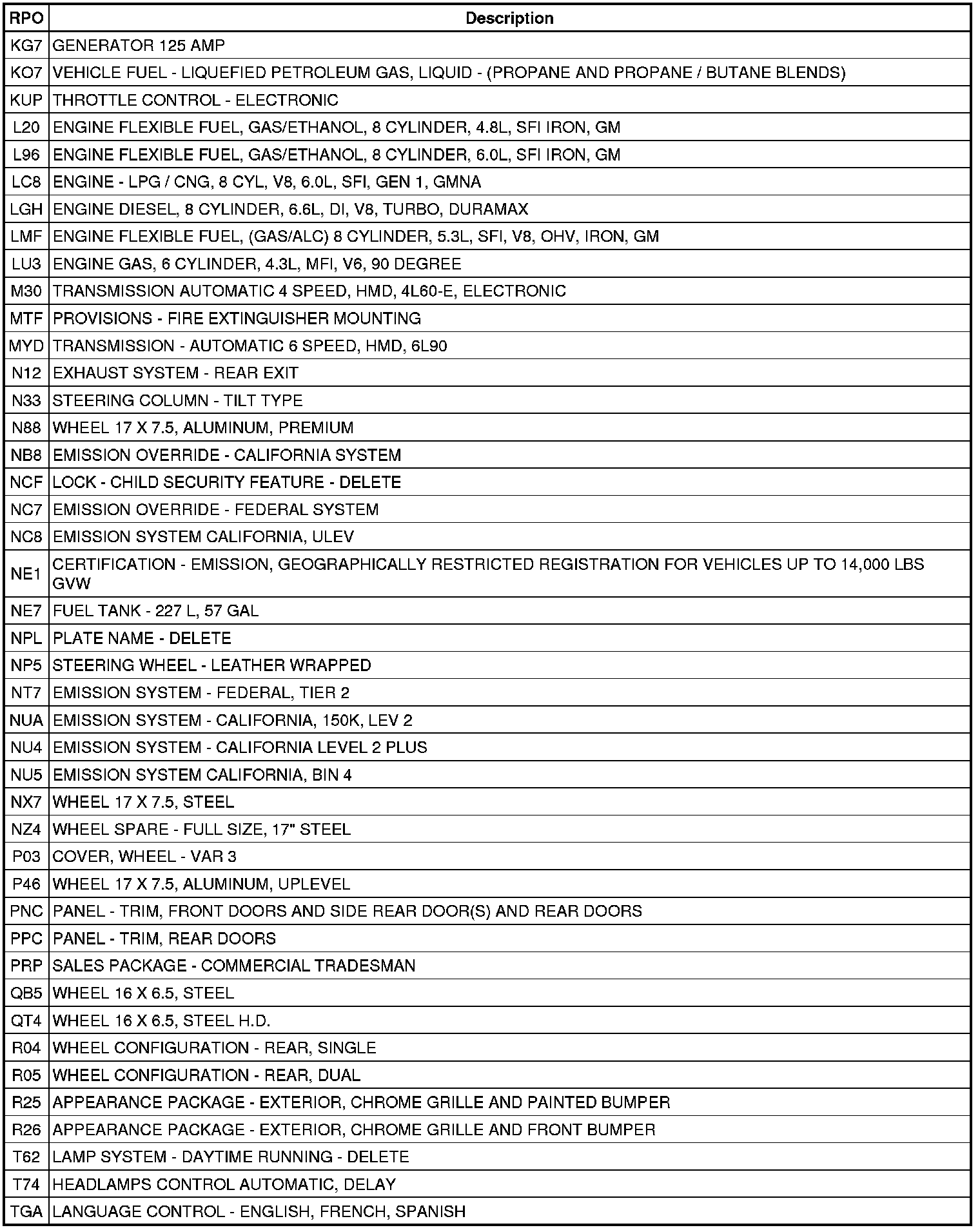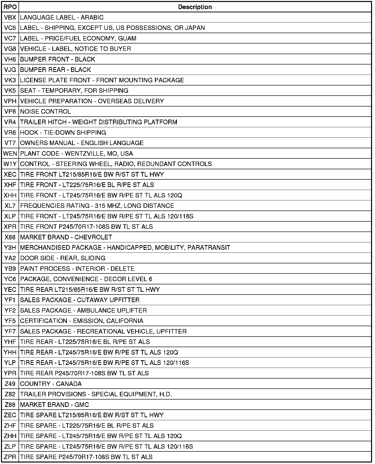 RPO Code List