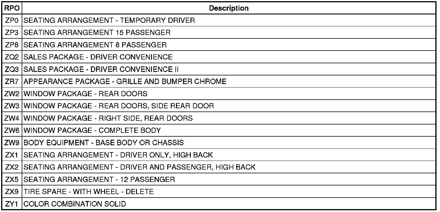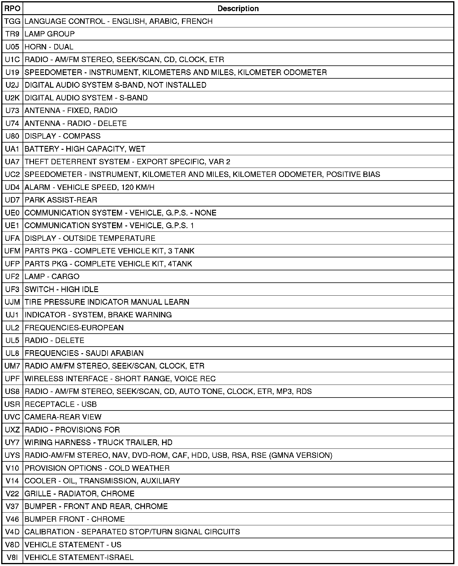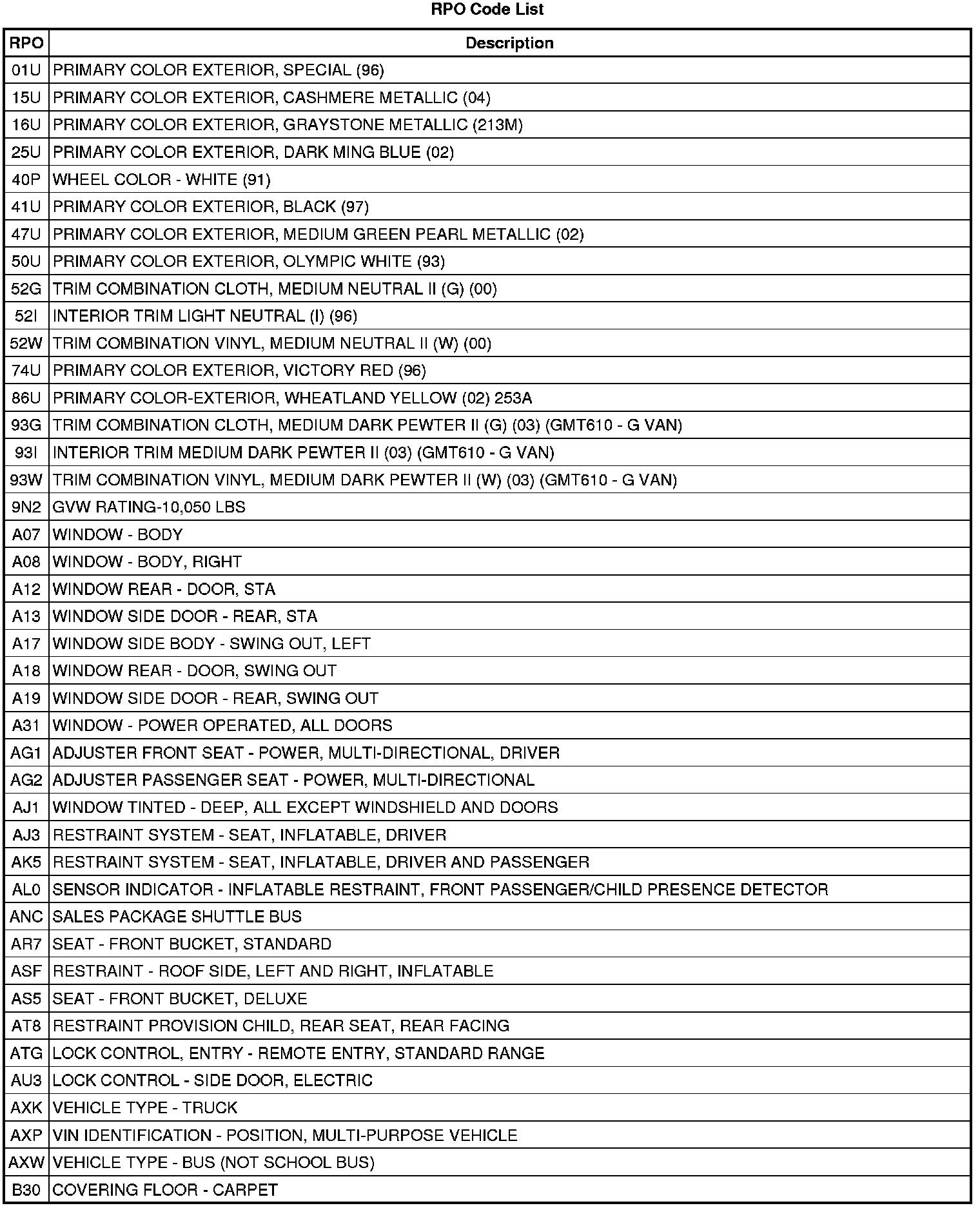 RPO Code List