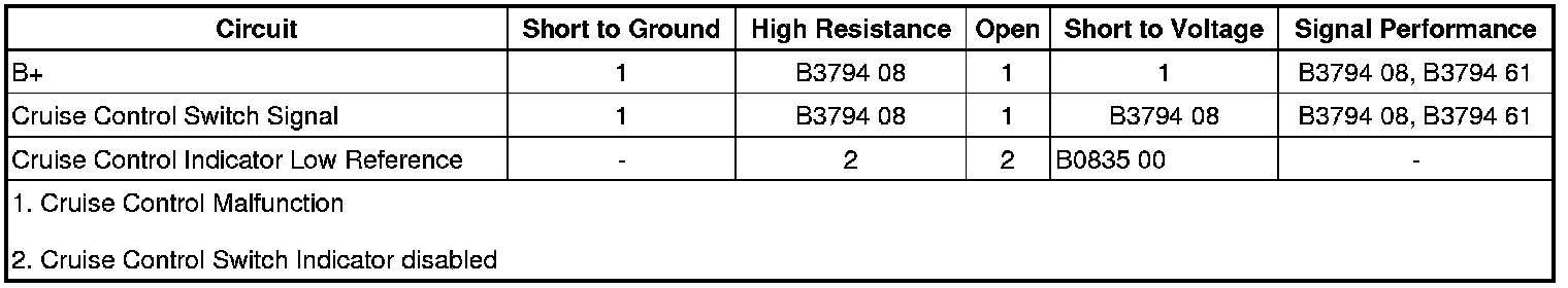 The body control module (BCM) supplies battery voltage to the cruise control switch. The cruise control switch signal is an input to the BCM. The BCM monitors the cruise control switch signal circuit in order to detect when the driver has requested to perform a cruise control function. The BCM detects a specific voltage signal on the cruise control switch signal circuit when a switch is applied.