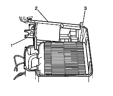 7. Remove the upper mode door (2) from the heater module (1).