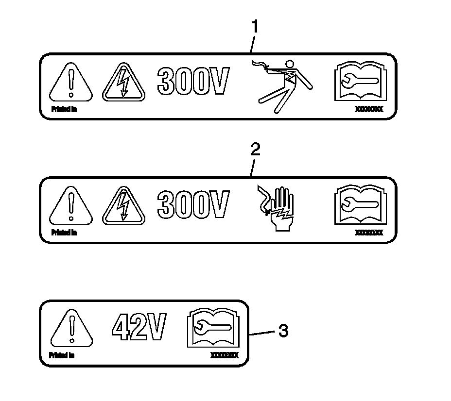 The wire harnesses and cables for high voltage circuits are encased in an orange colored covering. In addition, high voltage components such as the Energy Storage System and high voltage cables are affixed with "High Voltage" red danger (1) and orange warning (2) labels. The intermediate 42 volt system is encased in a blue colored covering, and has yellow caution (3) labels on the components, wire harnesses, and cables.