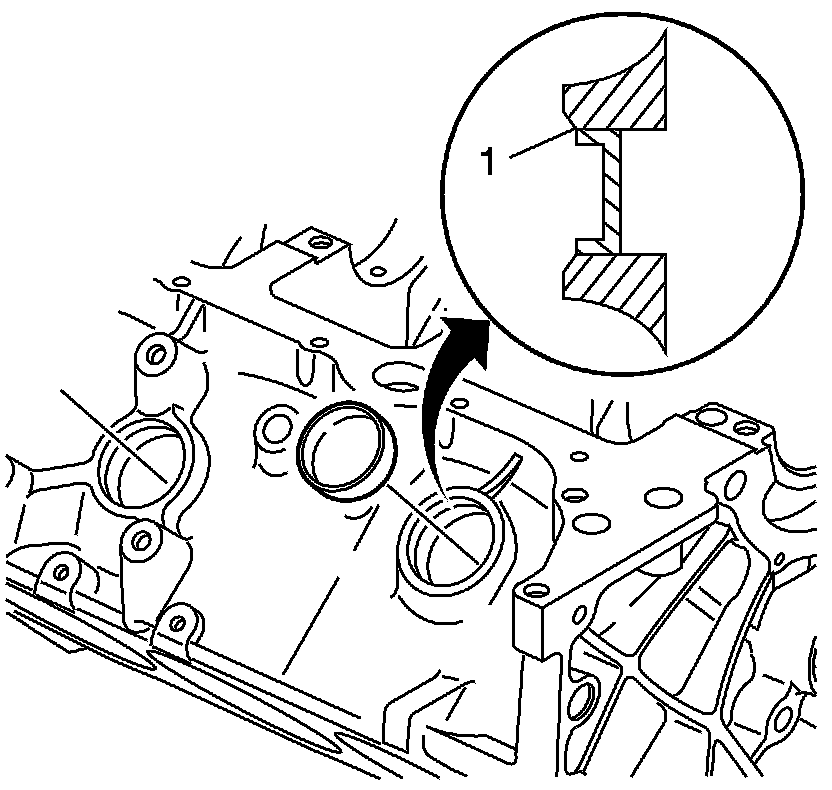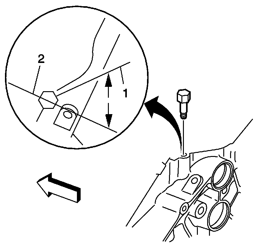 A properly installed engine block core hole plug must be installed flush or below the bottom of the chamfer (1) of the engine block core hole.