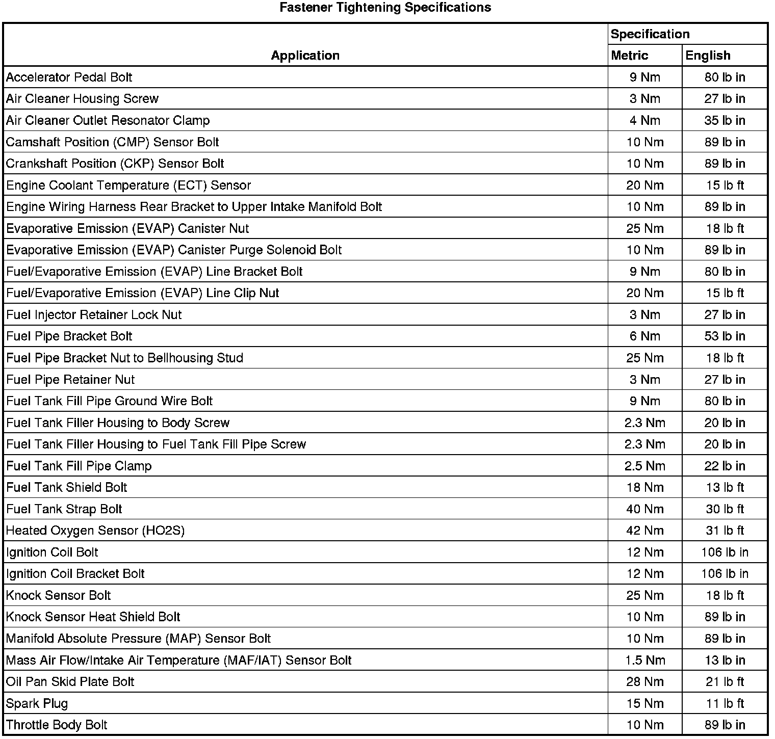 Fastener Tightening Specifications