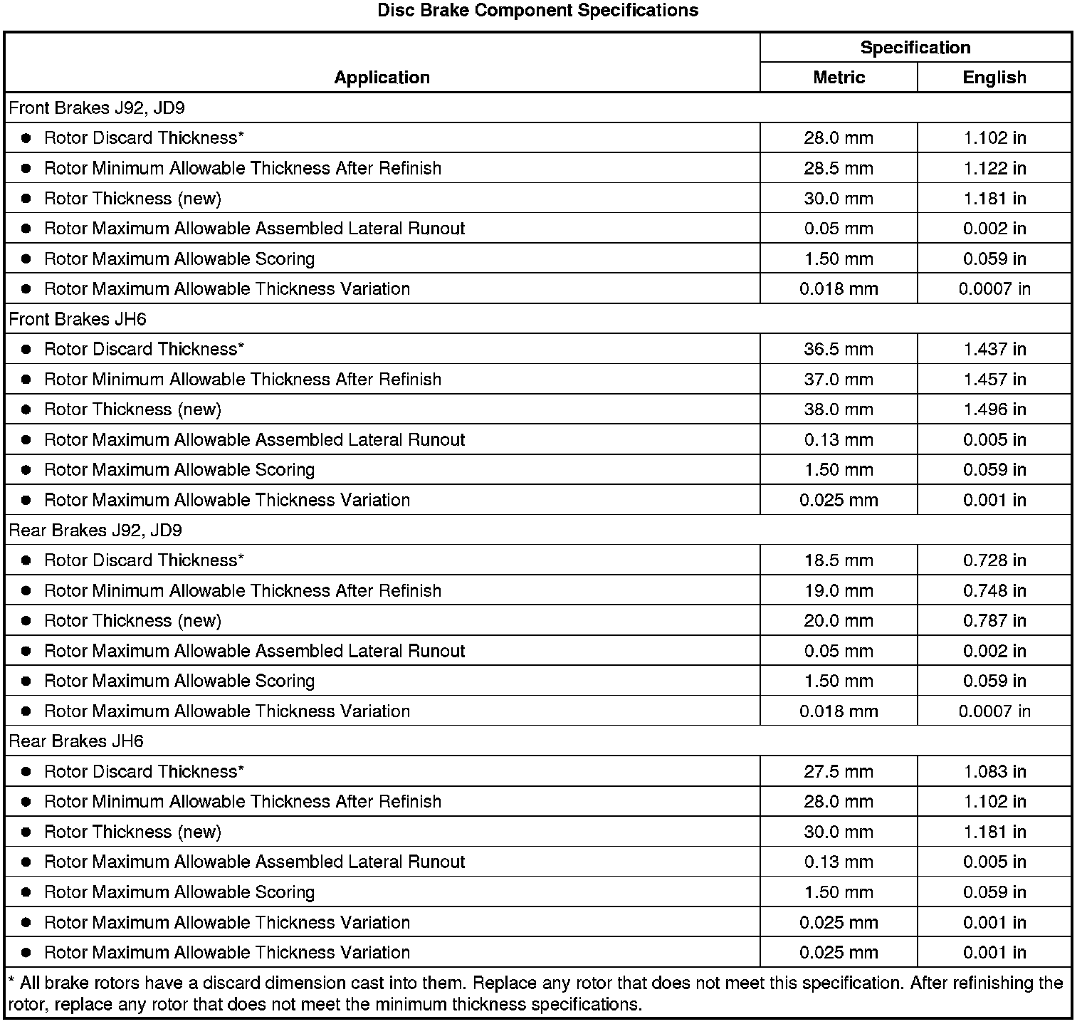Disc Brake Component Specifications