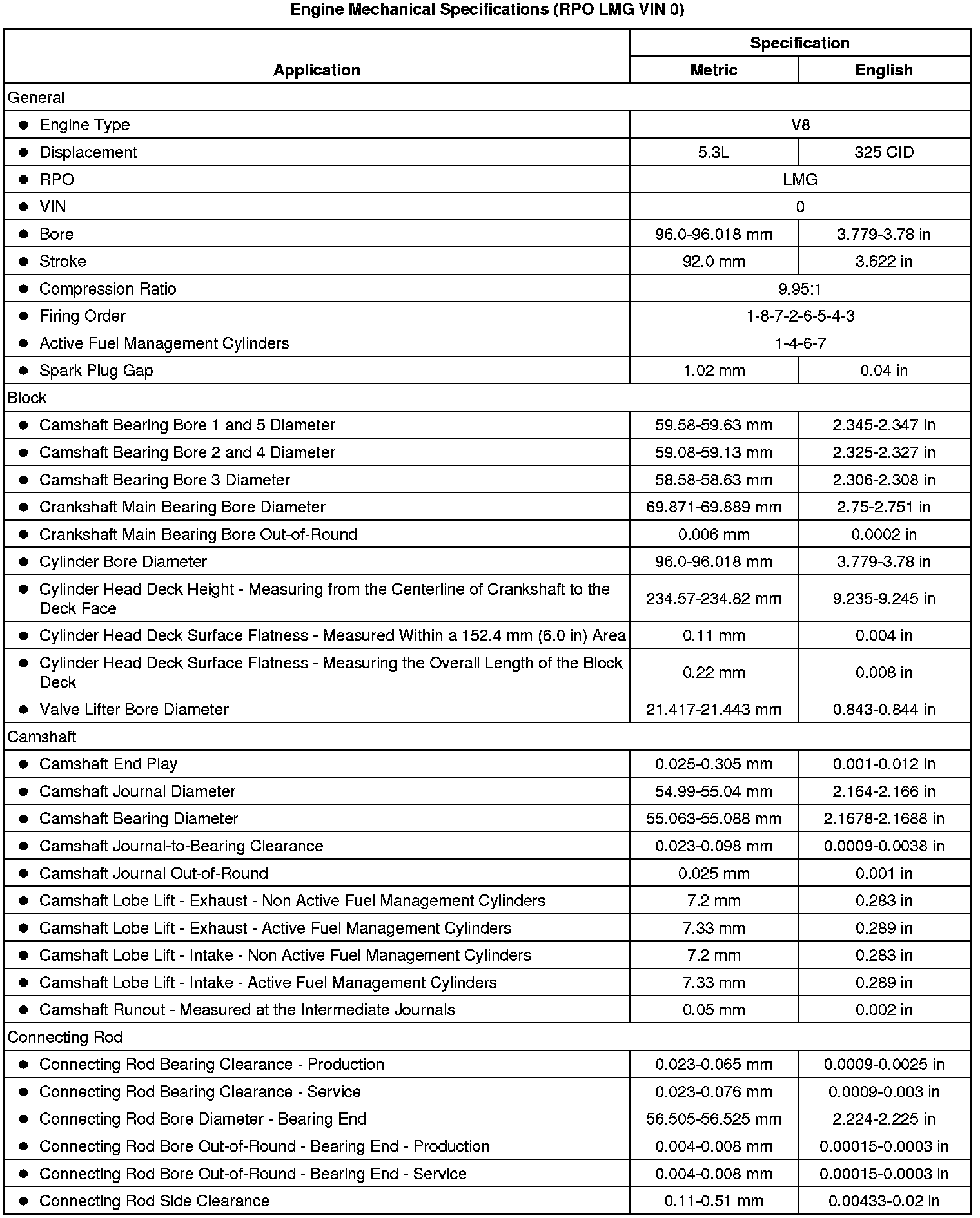 Engine Mechanical Specifications (RPO LMG VIN 0)