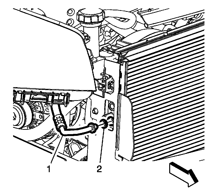 14. Remove the air conditioning compressor hose (2) from the air conditioning condenser.