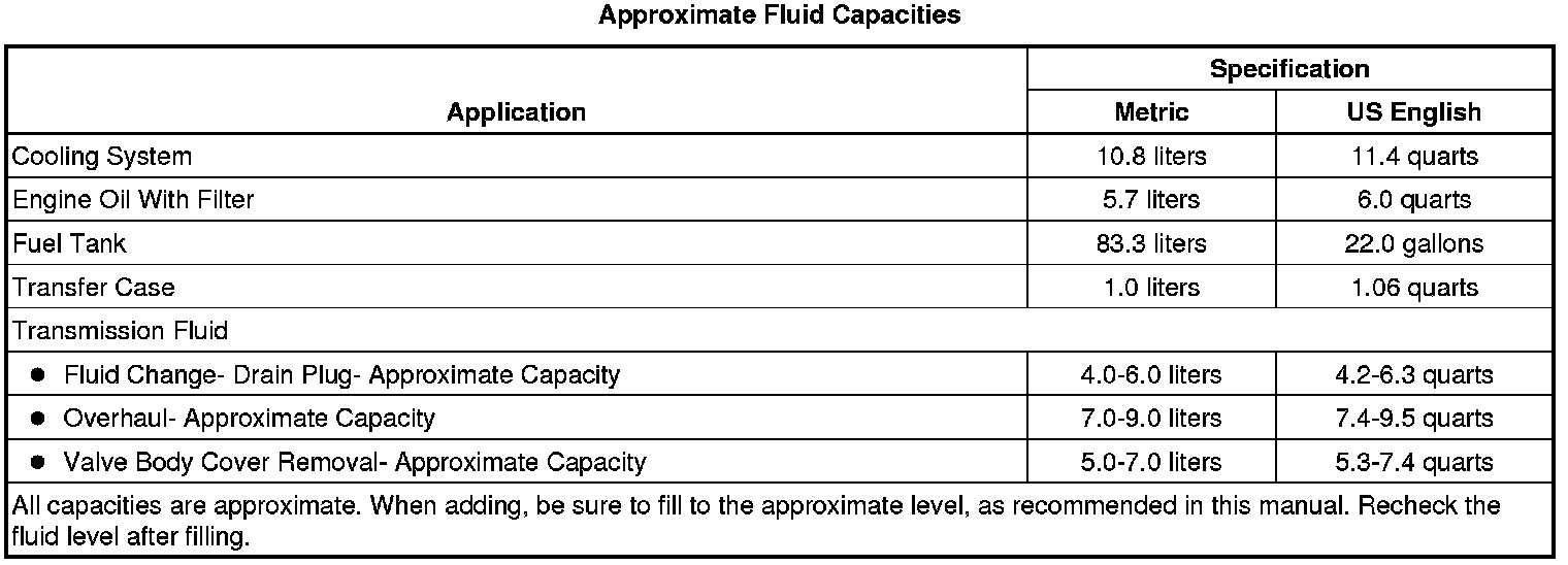 The following approximate capacities are given in US English and metric conversions. See Fluid and Lubricant Recommendations Maintenance for more information.