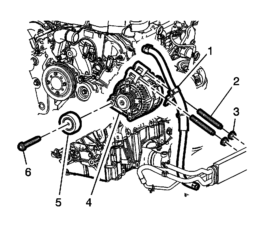 5. Tighten the idler pulley fastener (6) and the generator fasteners (3) in the following sequence: