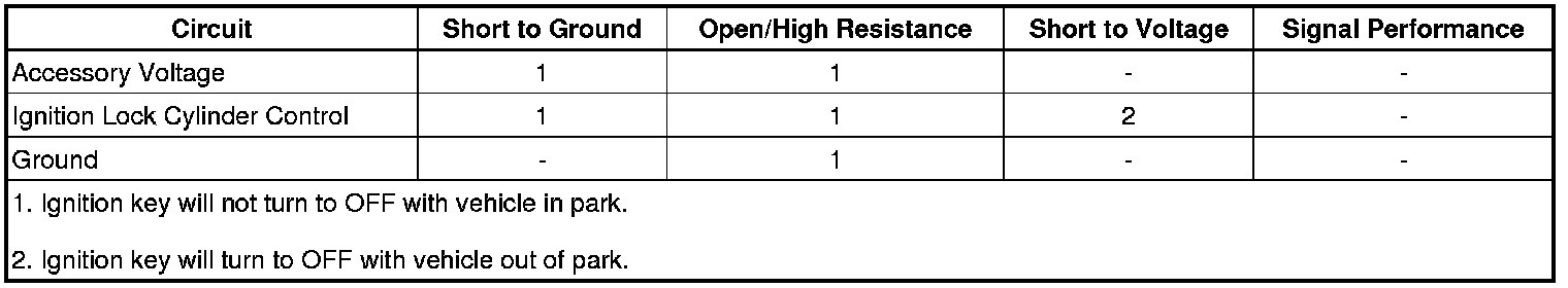• If the test lamp is always OFF, test the control circuit, and the ignition lock cylinder control switch accessory voltage circuit for a short to ground or open/high resistance. If the circuits test normal, test or replace the ignition lock cylinder control switch.