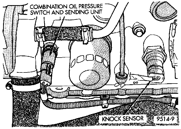 The knock sensor threads into the side of the cylinder block in front of the starter.