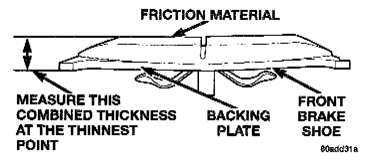 When a set of brake shoes are worn to a total thickness of approximately 7.95 mm (5/16 inch) or less, they should be replaced.
