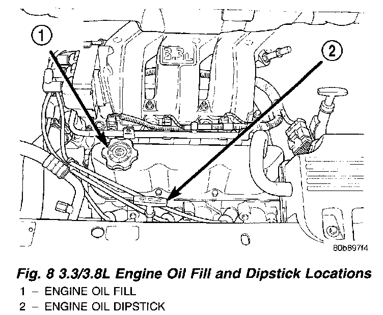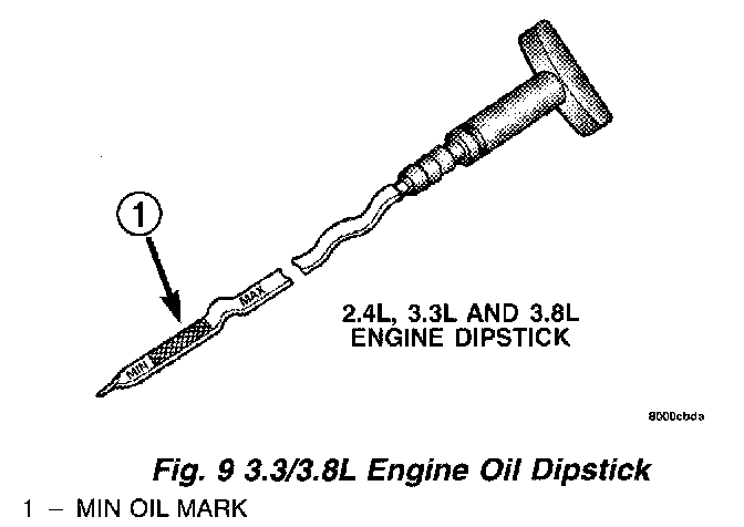 Checking the oil while the vehicle is on level ground, will improve the accuracy of the oil level readings. For the, 3.3/3.8L engines, maintain the oil level between the MIN and MAX markings on the dipstick (Fig. 9). Adding one quart of oil when the reading is at the MIN mark will result in a MAX reading on these engines.