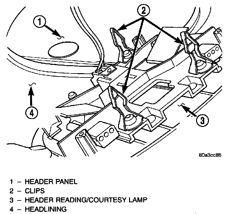 3. Align clips on reading/courtesy lamp to mating holes in roof header panel.