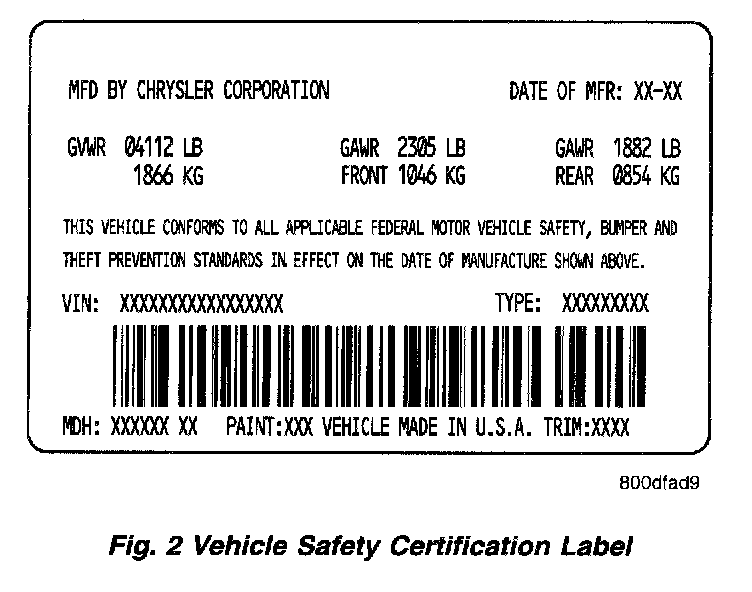 A vehicle safety certification label (Fig. 2) is attached to the rear facing of the driver's door. This label indicates date of manufacture (month and year), Gross Vehicle Weight Rating (GVWR), Gross Axle Weight Rating (GAWR) front, Gross Axle Weight Rating (GAWR) rear and the Vehicle Identification Number (VIN). The Month, Day and Hour of manufacture is also included.