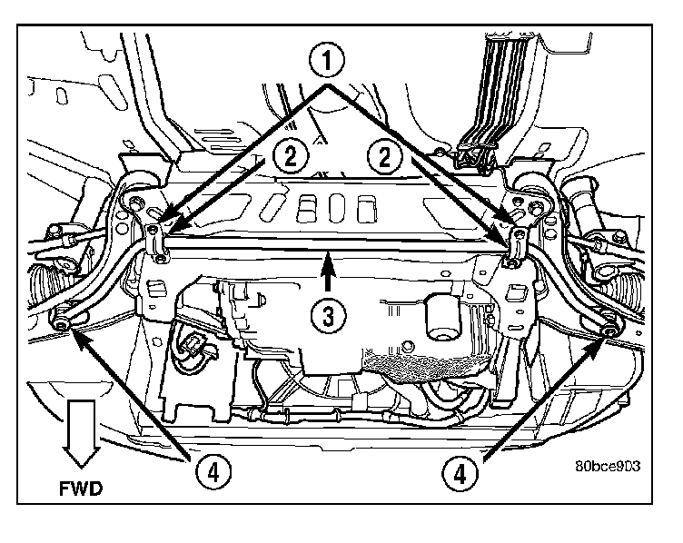 15. Position a transmission jack under the center of the front suspension crossmember (3) and raise it to support the bottom of the crossmember.