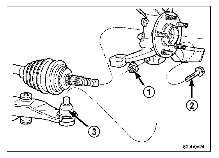 CAUTION: After removing the steering knuckle from the ball joint stud, do not pull outward on the knuckle. Pulling the steering knuckle outward at this point can separate the inner c/v joint on the driveshaft.