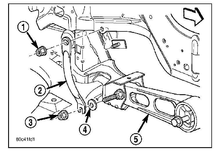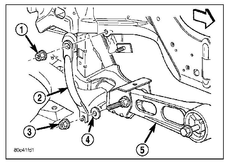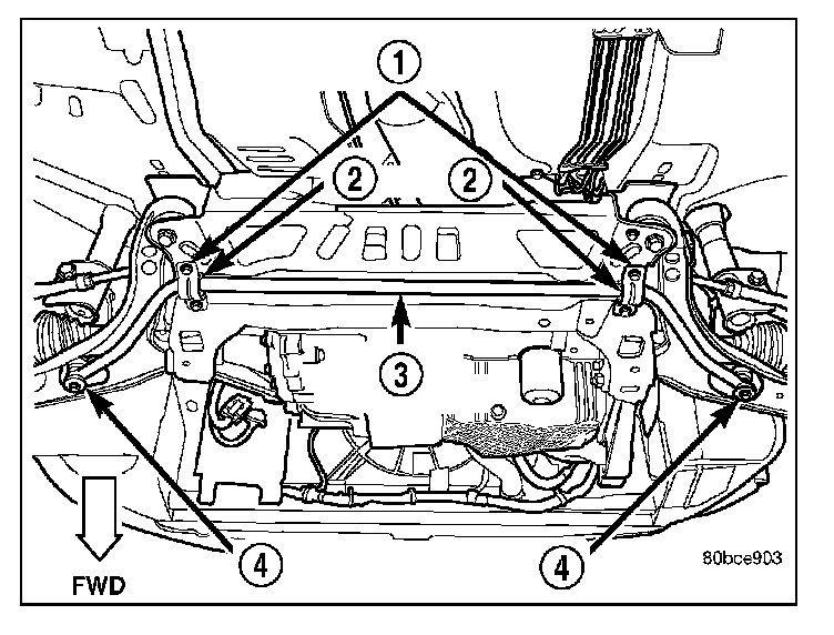 4. Using a soft face hammer, tap the front suspension crossmember back-and-forth or side-to-side until it is aligned with the previously scribed positioning marks (1) on the body of the vehicle. Once the front suspension crossmember is correctly positioned, tighten the two crossmember mounting bolts through the lower control arm rear isolator bushings to a torque of 250 N.m (185 ft. lbs.), then tighten the four remaining crossmember mounting bolts to a torque of 153 N.m (120 ft. lbs.).
