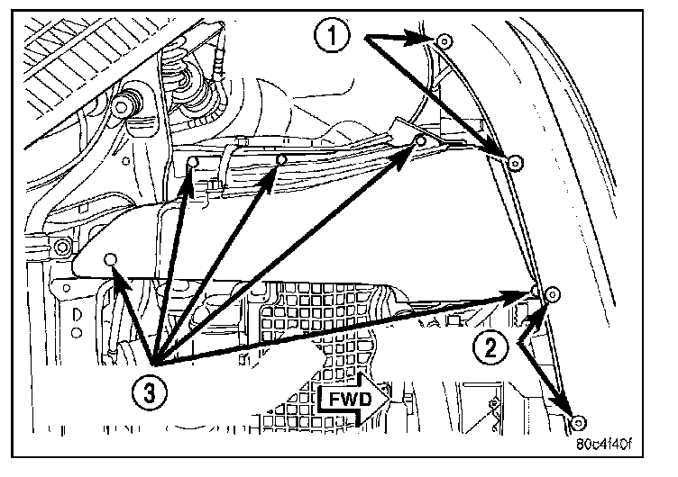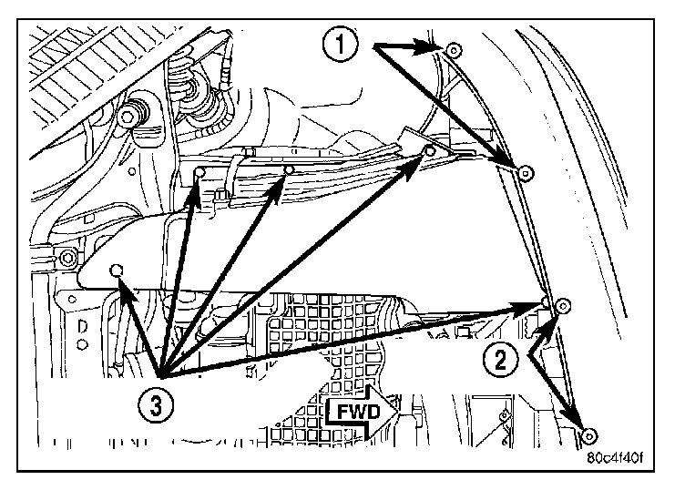 11. Remove the screws (1) fastening the front fascia to the reinforcement as necessary in order to access the drive-belt splash shield forward fastener screws.