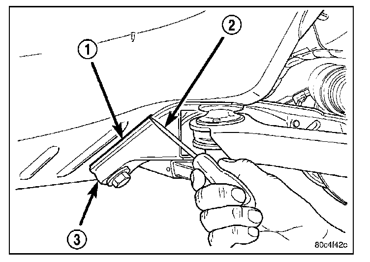 14. Using an awl, (2) scribe a line (1) marking the location of the front suspension crossmember (3) where it is mounted against the body of the vehicle.