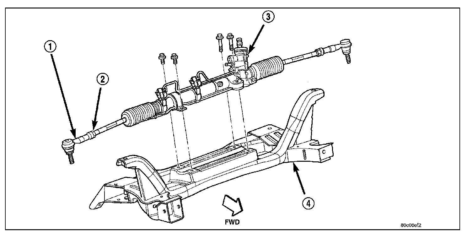 7. Attach the steering gear (3) to the front suspension crossmember (4). Install the four power steering gear mounting bolts. Tighten the mounting bolts to a torque of 61 N.m (45 ft. lbs.).
