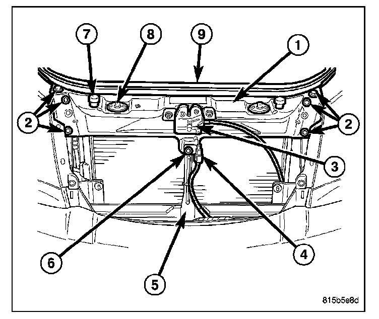 7. Remove the six bolts (2) that secure the upper radiator support to the fenders.