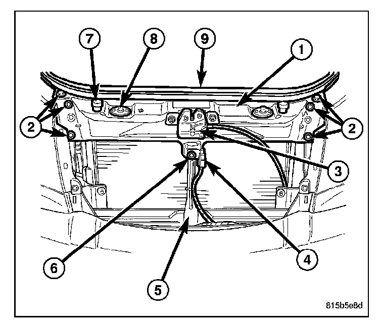2. Install the six bolts (2) that secure the upper radiator support to the fenders. Tighten the bolts securely.