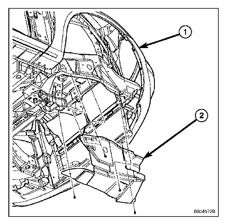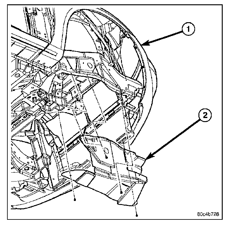 1. Position the right side rail splash shield (2) to the vehicle.
