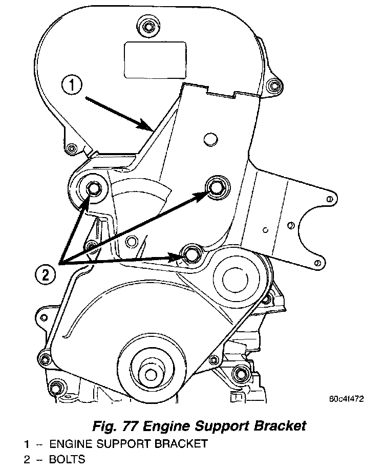 2. Install right engine support bracket (Fig. 77). Ensure the power steering pump is properly located in mounting location on bracket. Tighten mount bracket bolts to 61 Nm (45 ft. lbs.).