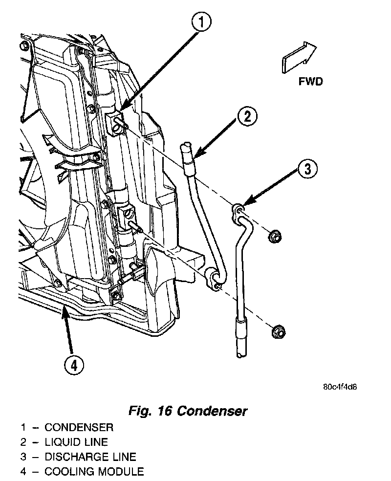 The condenser is integral to a cooling module which includes the radiator, the electric cooling fan, the fan shroud, air seals and an automatic transmission oil cooler on models so equipped. The cooling module is located in the air flow in the front of the engine compartment behind the front grille.