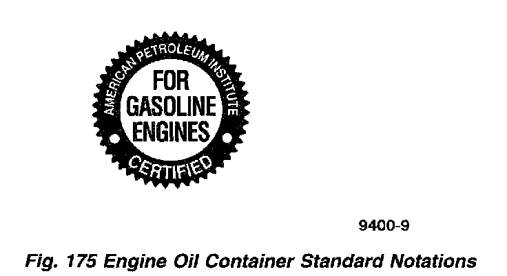 Standard engine oil identification notations have been adopted to aid in the proper selection of engine oil. The identifying notations are located on the label of engine oil plastic bottles and the top of engine oil cans (Fig. 175).