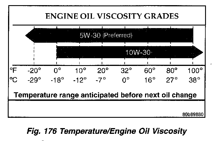 An SAE viscosity grade is used to specify the viscosity of engine oil. Use only engine oils with multiple viscosities such as 5W-30 or 10W-30. These are specified with a dual SAE viscosity grade, which indicates the cold-to-hot temperature viscosity range. Select an engine oil that is best suited to your particular temperature range and variation (Fig. 176).