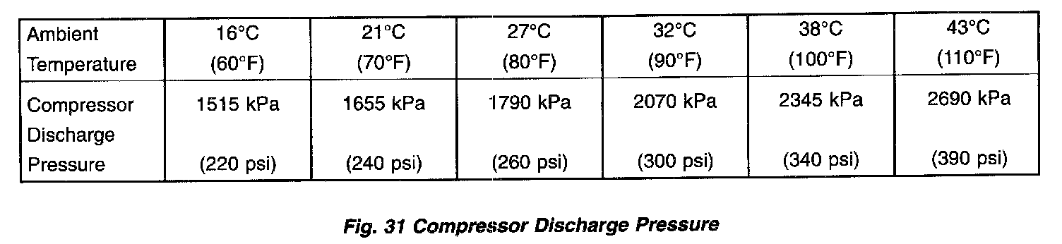 11. Record the compressor discharge pressure. If the reading is higher than the pressure shown in the Compressor Discharge Pressure chart, the system could be overcharged. If the reading is equal to, or lower, than the pressure shown in the chart, continue with this procedure.