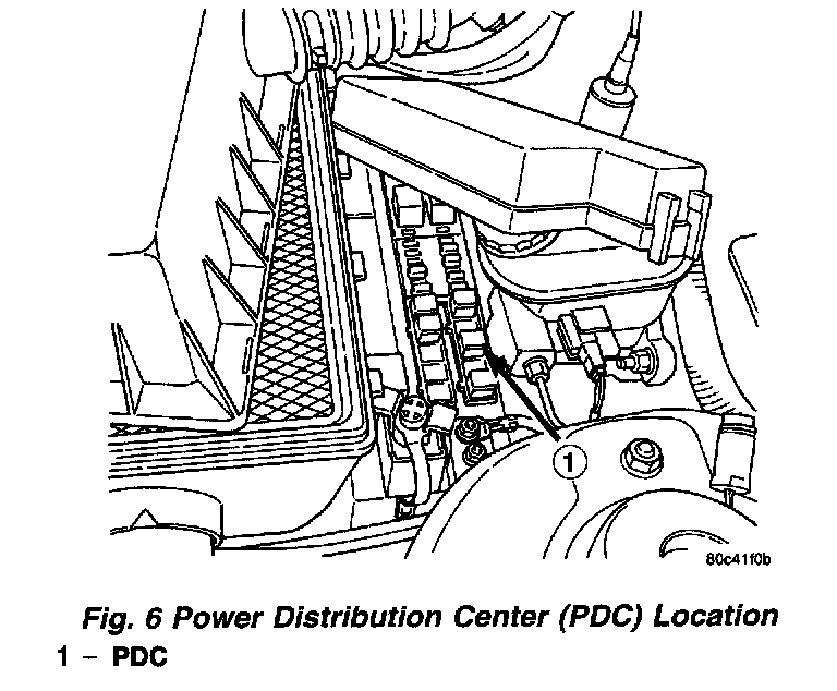 The molded plastic PDC housing is located in the left front corner of the engine compartment, just behind the air cleaner housing and the battery.