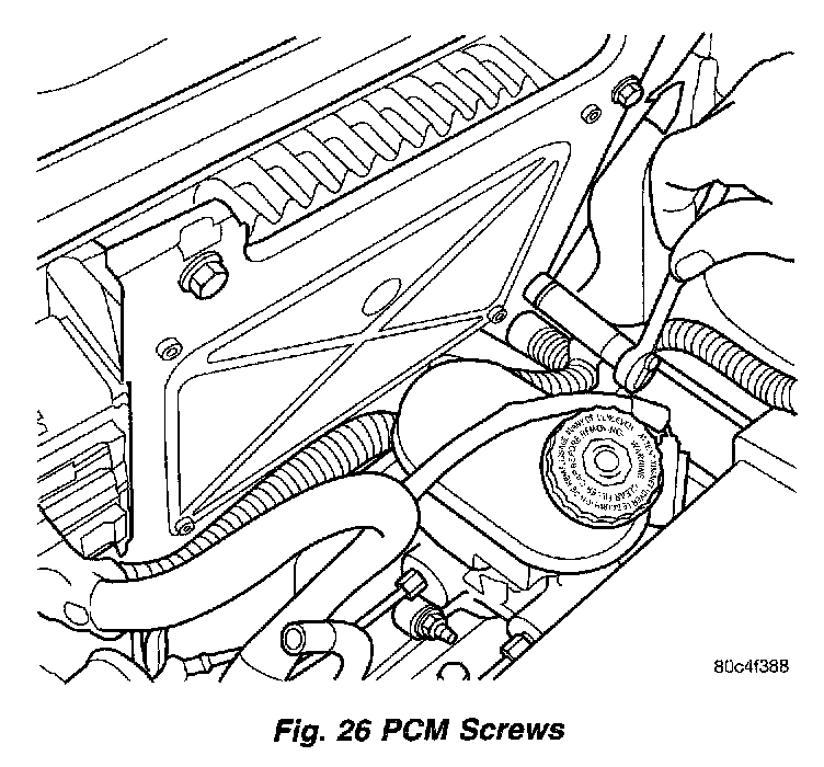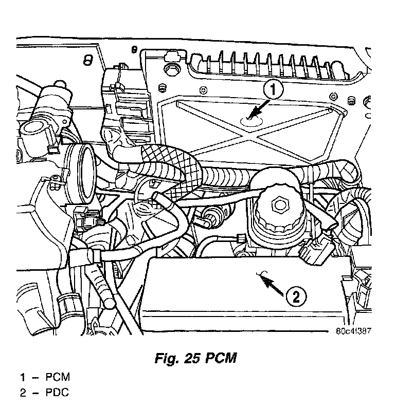 The PCM engine control strategy prevents reduced idle speeds until after the engine operates for 320 km (200 miles). If the PCM is replaced after 320 km (200 miles) of usage, update the mileage and vehicle identification number (VIN) in the new PCM. Use the DRB scan tool to change the millage and VIN in the PCM. If this step is not done a Diagnostic Trouble Code (DTC) may be set. Refer to the appropriate Powertrain Diagnostic and the DRB scan tool.Fig.25 PCM: