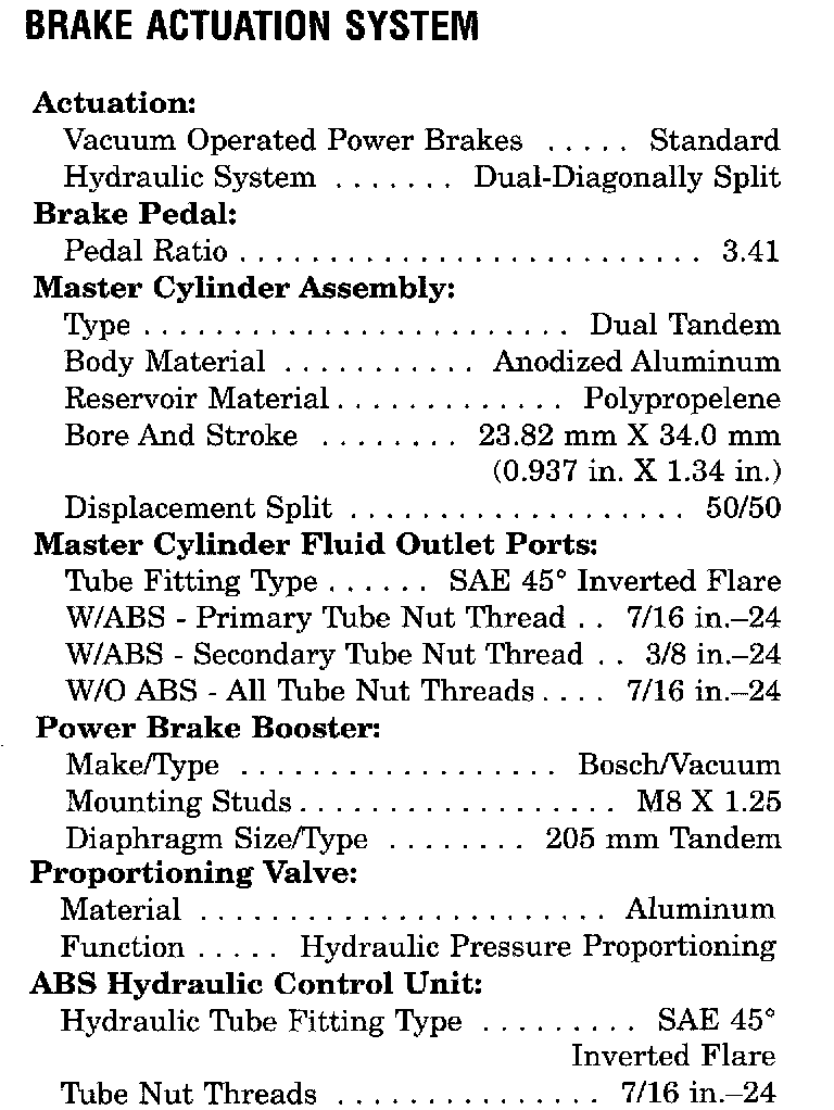 Brake Actuating System Specifications