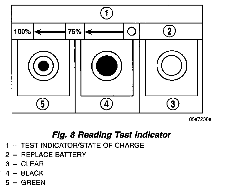 A completely discharged battery requires more charging time than a partially charged battery. Electrolyte is nearly pure water in a completely discharged battery At first, the charging current amperage will be low, As water is converted back to sulfuric acid inside the battery, the current amp rate will rise. Also, the specific gravity of the electrolyte will rise, bringing the green ball (Fig. 8) into view at approximately 75 percent state-of-charge.