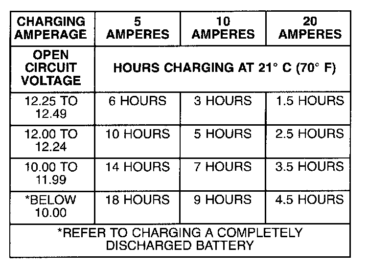 A completely discharged large heavy-duty battery may require more recharging time than a completely discharged small capacity battery. Refer to the Battery Charging Timetable for charging times.