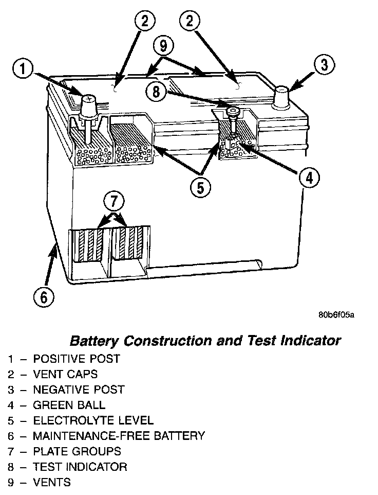 A clear color dot shows electrolyte level in battery is below the test indicator. Water cannot be added to a maintenance free battery. The battery must be replaced. A low electrolyte level may be caused by an over charging condition. Refer to Charging System to determine if the charging system is OK or not.