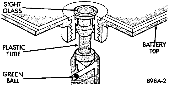 The Test Indicator measures the specific gravity of the electrolyte. Specific Gravity (SG) of the electrolyte will show state- of-charge (voltage). The test indicator WILL NOT show cranking capacity of the battery. Refer to Battery Load Test for more information. Look into the sight glass and note the color of the indicator. Refer to the following description of colors: