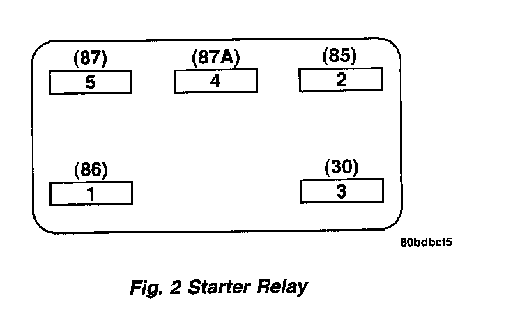 1. A relay in the de-energized position should have continuity between terminals 87A and 30, and no continuity between terminals 87 and 30. If OK, go to Step 2. If not OK, replace the faulty relay.