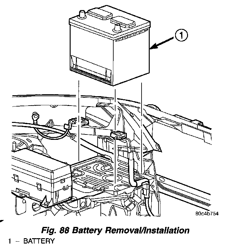 3. Remove the battery hold down clamp and remove the battery (Fig. 88).