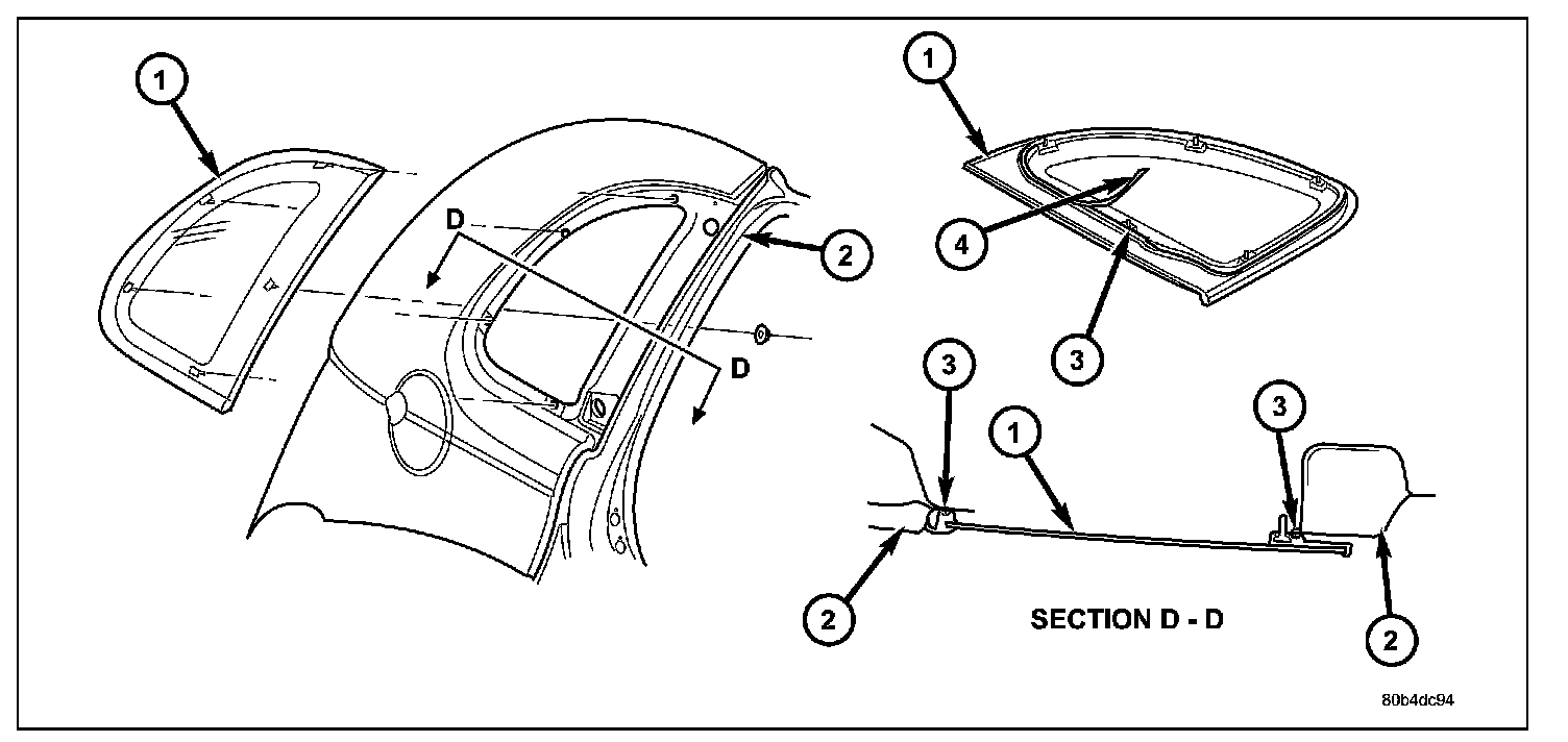5. Remove the quarter window glass (1) from the vehicle by pushing on glass from inside of vehicle.