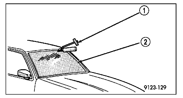 10. With the aid of a helper, position the windshield over the windshield opening and install contacting header spacers then load glass hooks onto the roof panel hooks (2).