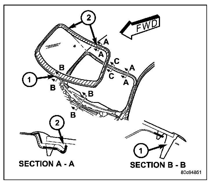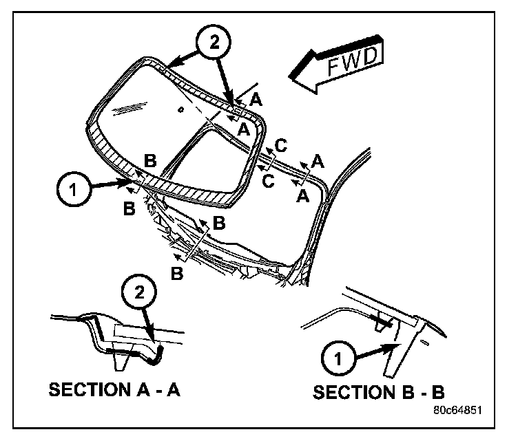 11. Apply a bead of urethane (4) on windshield glass as indicated.