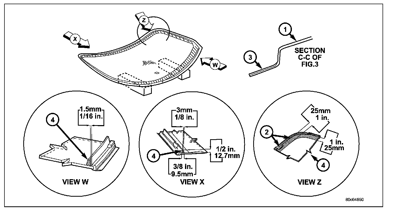 3. Verify glass encapsulation lays evenly along roof panel and that there is no gapping of the glass to spacers in the windshield opening. If gaps are present, the pinch weld fence must be formed to the shape of the new glass.