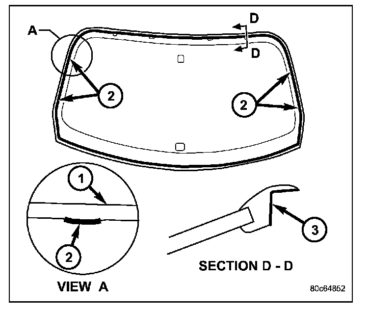3. Verify replacement windshield has squeak tape (2) and anti-squeak lube (3). If not present, install squeak tape and anti-squeak lube.
