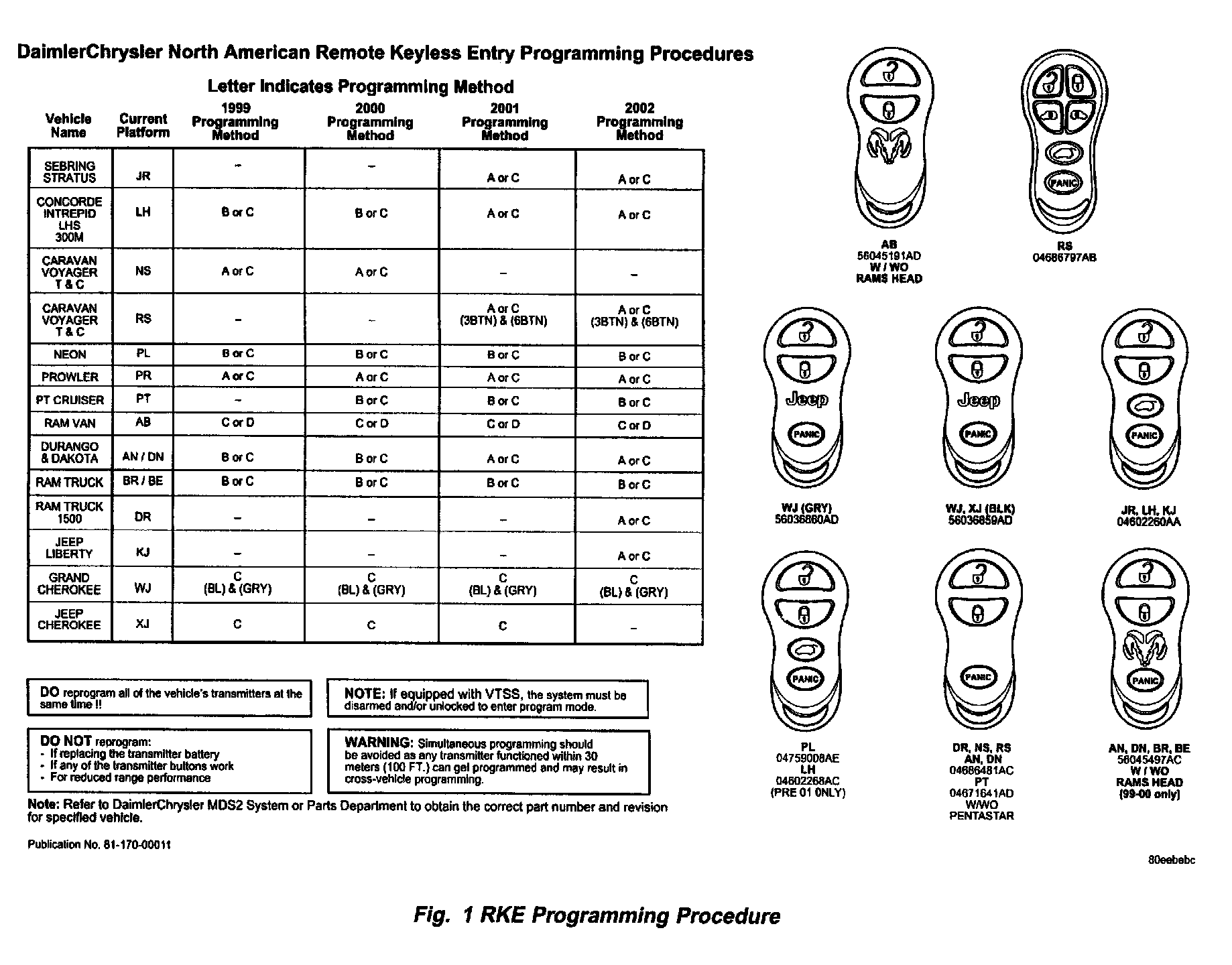A Remote keyless Entry (RKE) Programming Procedures Card (Publication No. 81-170-00011) is being provided with this Technical Service Bulletin to simplify RKE transmitter programming on 1999 - 2002 North American vehicles. Additional copies of the RKE publication, 81-170-00011 (Fig. 1), can be ordered from DDS Distribution Services, LTD. Their number is 1-800-890-4038.