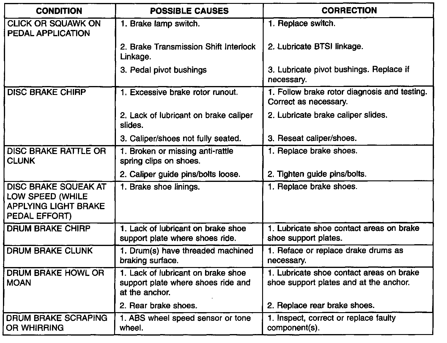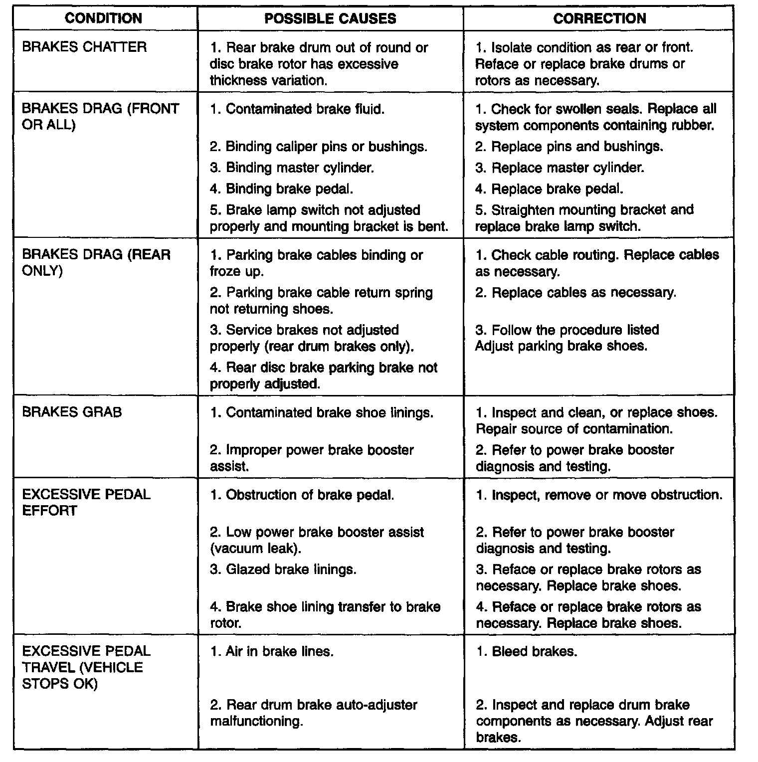 DIAGNOSIS AND TESTING - BASE BRAKE SYSTEMNOTE: There are three diagnosis charts following that cover the RED BRAKE WARNING INDICATOR LAMP, BRAKE NOISE and OTHER BRAKE CONDITIONS.
